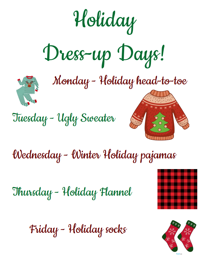 See Flyer at the bottom for Student Council dress up days.